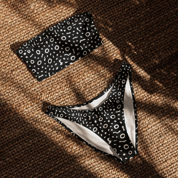 Featuring a striking Eagle Ray-inspired pattern, this set offers a flattering fit with a supportive bandeau top and high-rise bottoms designed to stay in place whether you're diving into the waves or lounging on the sand.
